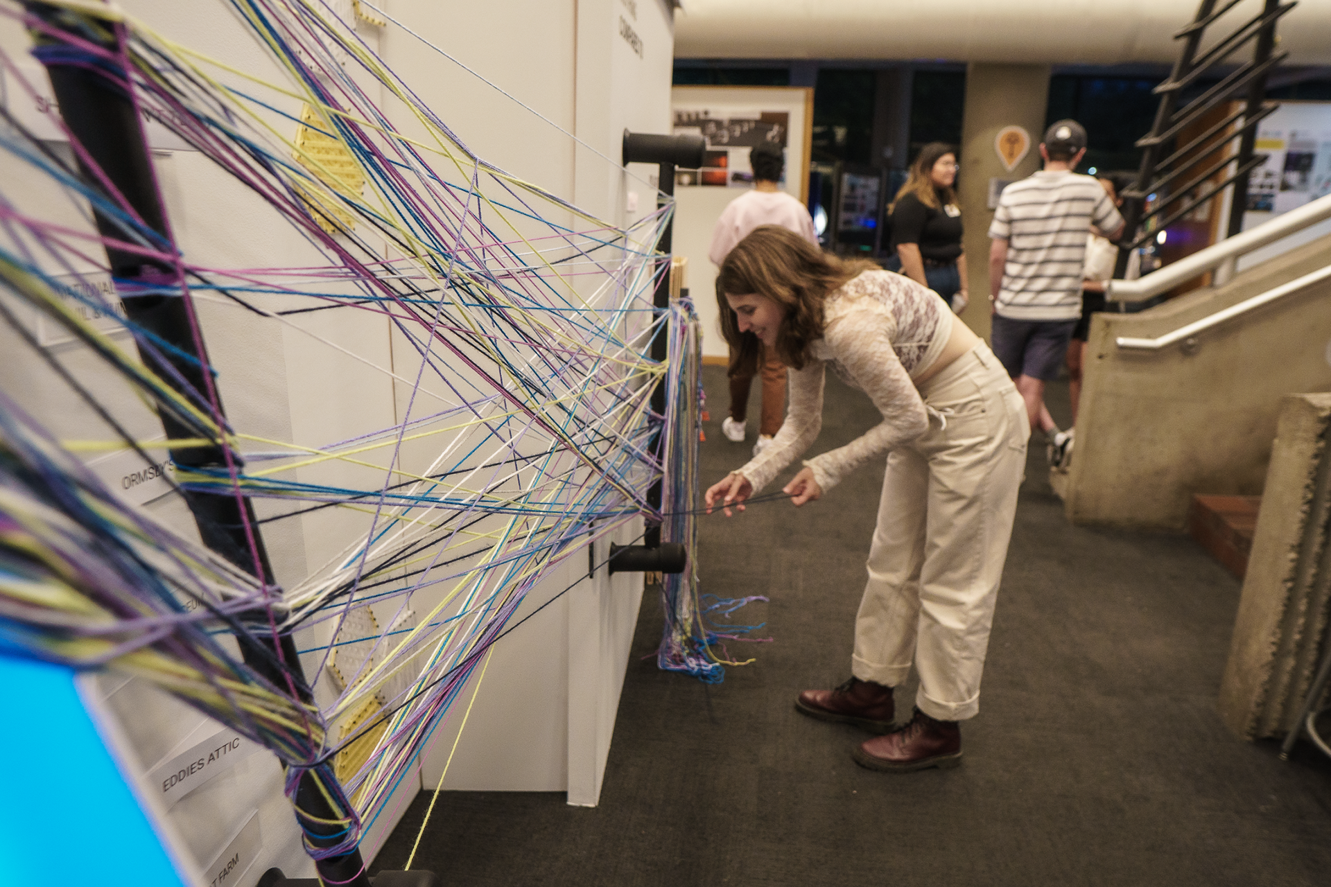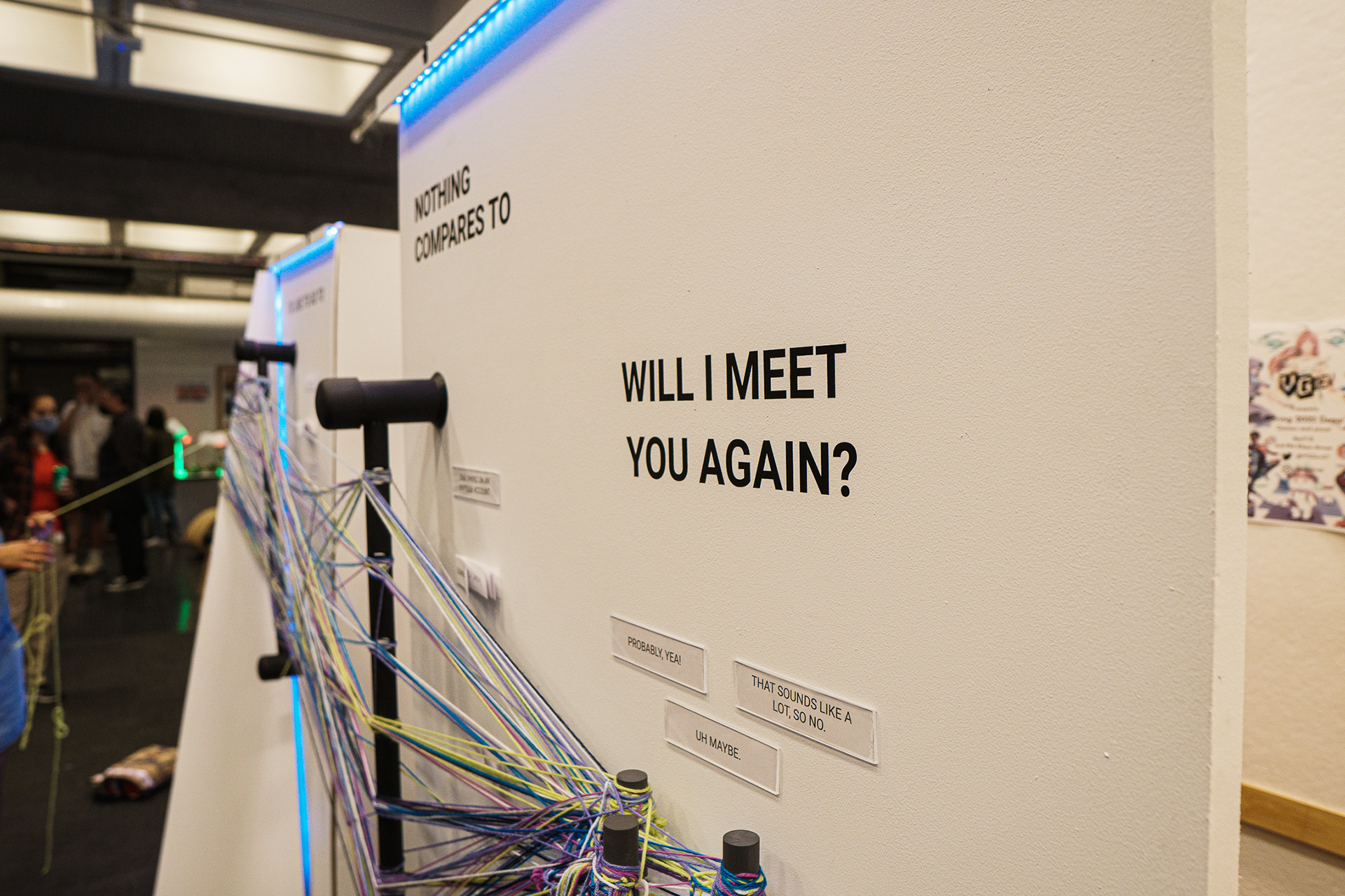 The installation would be located in a hotel lobby to display the interweaving of threads. Each thread represents one traveler and is reactive based on their answers to questions that probe their travel experience. Every choice changes a specific element (tempo, instrument, pitch, etc.) of a tune to produce a short song personally customized to be played in elevators and upon entry into their hotel room, giving guests a uniquely intimate experience.